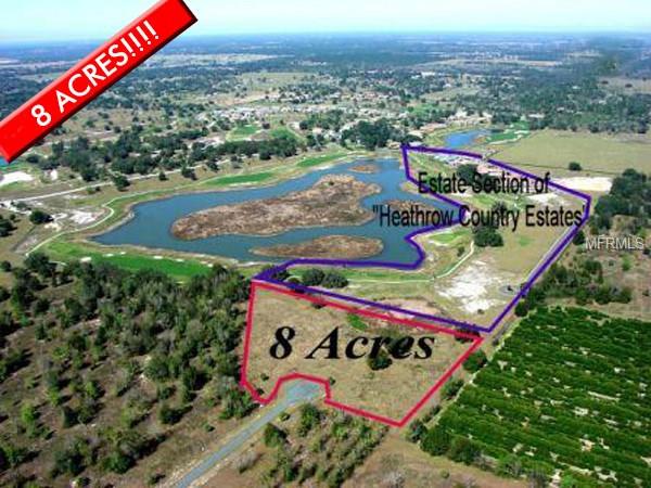 This is an amazing 8 acres of property which is located in the rear of Red Tail Country Club (access off hwy 46) bordering the golf course. Close to the new 429 entrance and exit for the beltway. A small pond which you are sharing with Red Tail Country Club and a wooden fence is separating you from this world class development. Build a 12,000 sqft home, add a guest house, enjoy your own tennis court. Join the Heathrow Country Estates golf course and park your million dollar motor home or any toy right next to your home. And yet, you are not paying for the Heathrow Country Estate HOA, you are not under their restrictions, you own your own compound at the end of this quaint cul-de-sac. And yes, Mount Dora and Lake Mary with their great restaurants and shops is just close by.